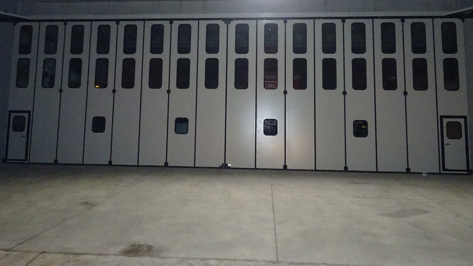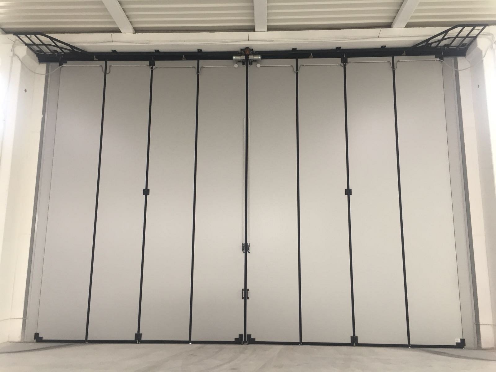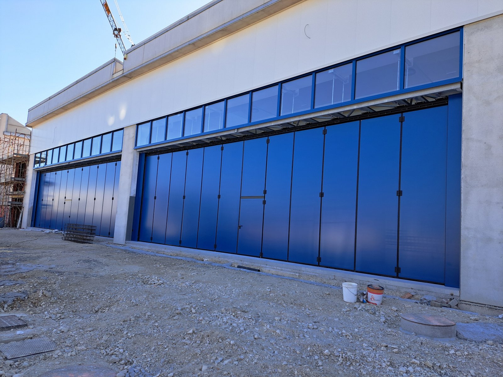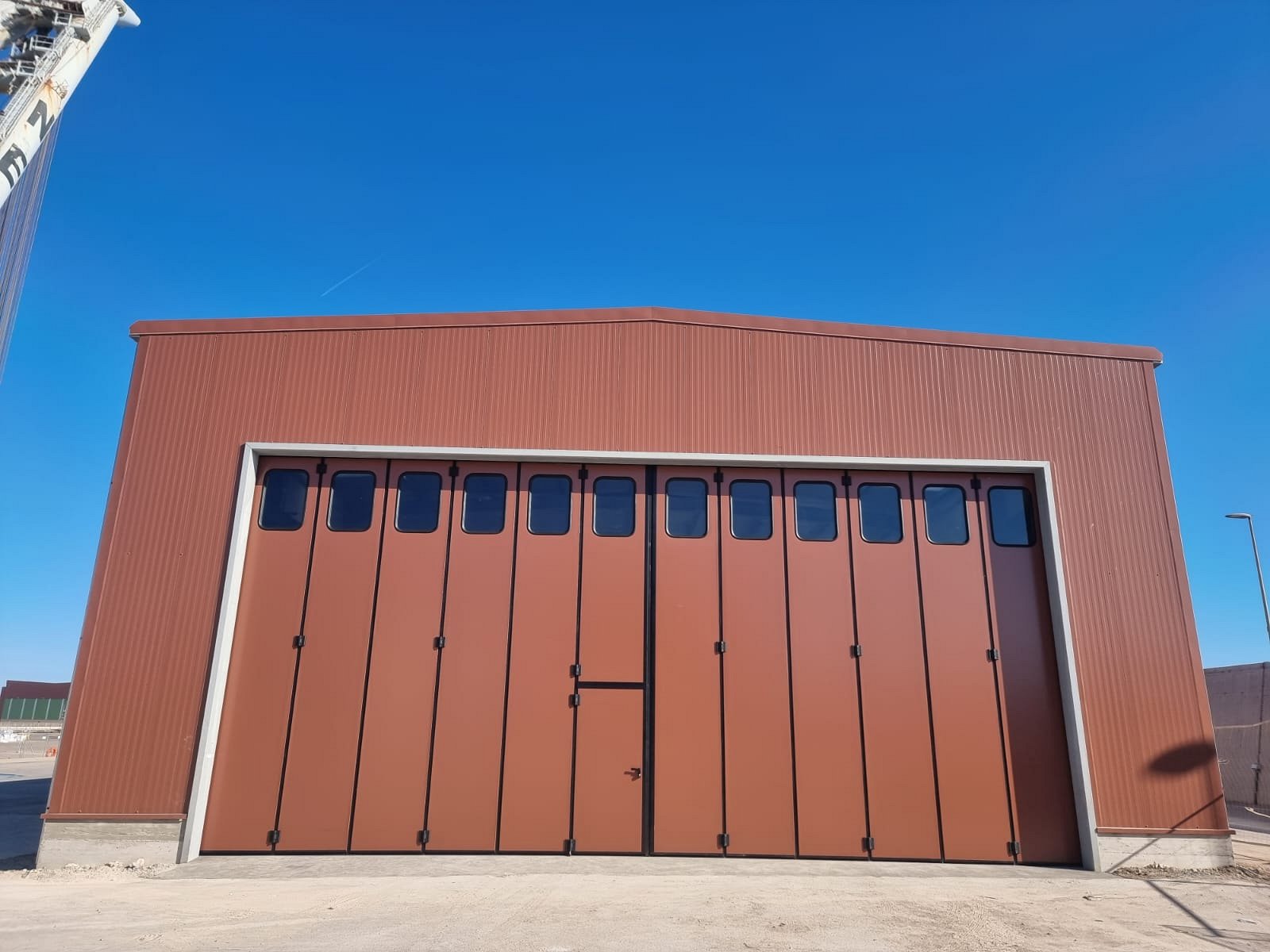 Apertura a libro con guida inferiore: Permette un movimento fluido e stabile anche in presenza di vento, ideale per capannoni, magazzini e aree logistiche con varchi di grandi dimensioni.