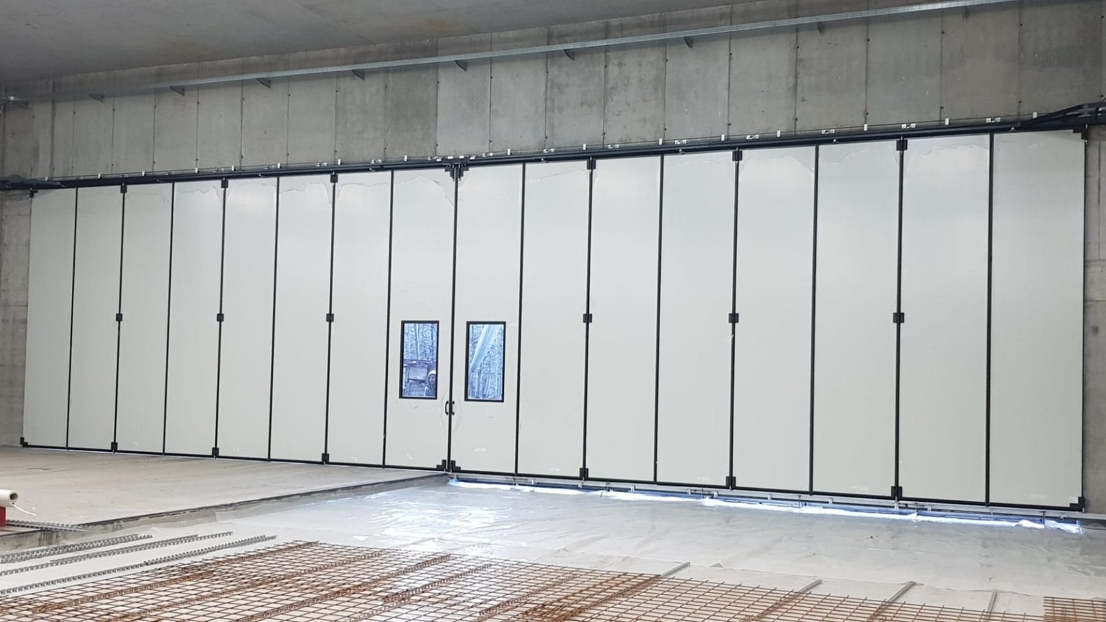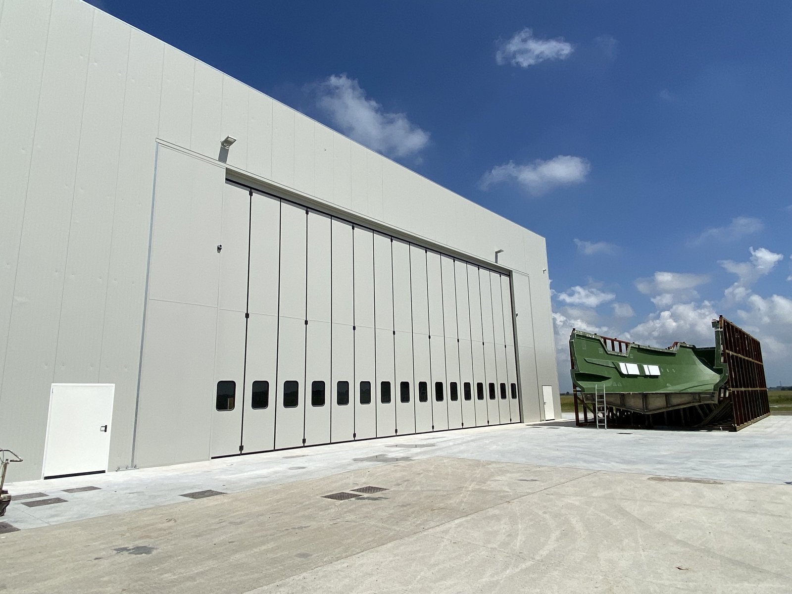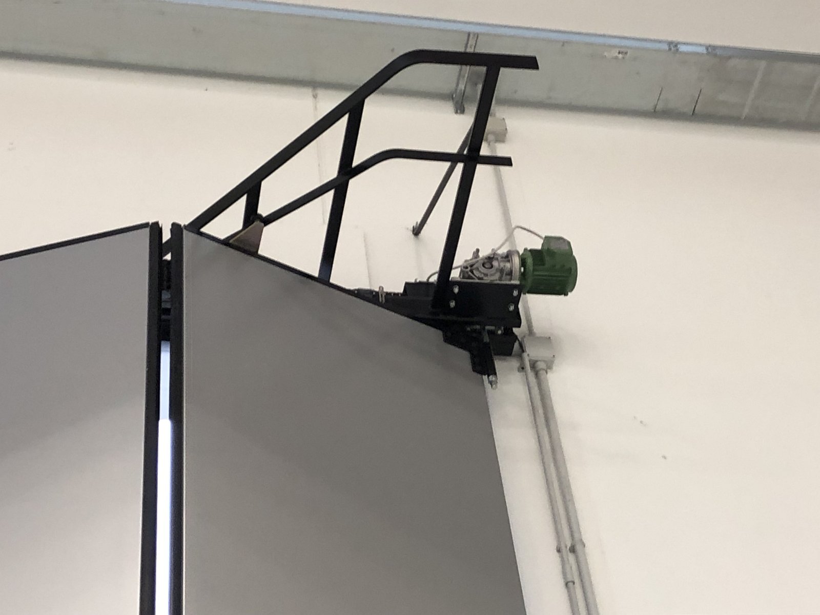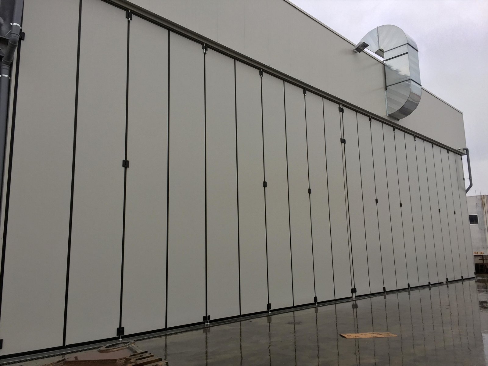Apertura a libro con guida inferiore: Permette un movimento fluido e stabile anche in presenza di vento, ideale per capannoni, magazzini e aree logistiche con varchi di grandi dimensioni.